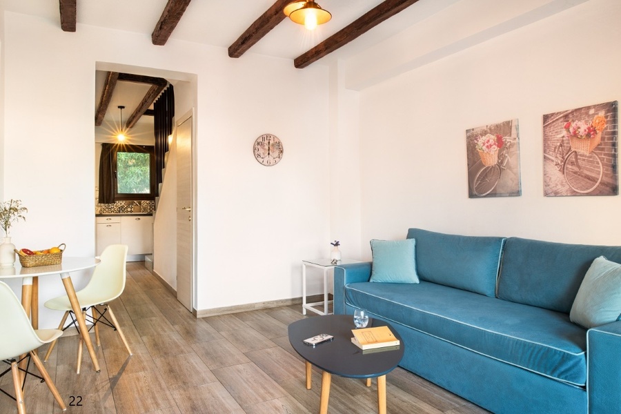 No: 11 i 12 1/3+1 mezoneta - NISKO PRIZEMLJE / VISOKO PRIZEMLJEna donjem nivou u niskom prizemlju se nalazi spavaća soba sa bračnim ležajem, na visokom prizemlju se nalazi druga prostorija sa čajnom kuhinjom i sofom (2*180cm*75cm). (sofa je predvidjena za max. jednu odraslu osobu i jedno dete do 11 godina).