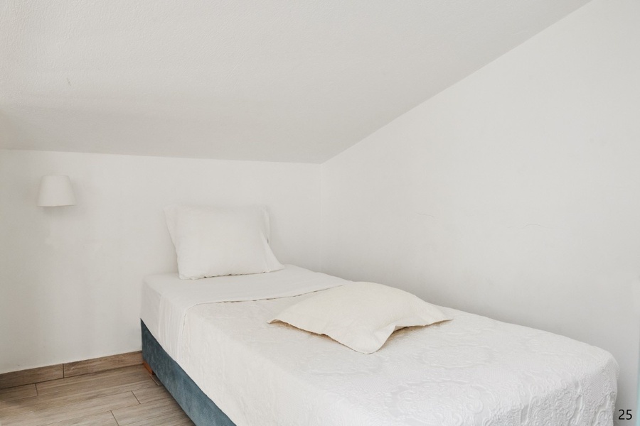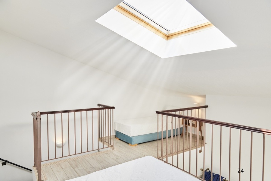 No: 25 1/5 mezoneta - I SPRAT / II SPRAT na prvom spratu se nalazi kuhinja. sofa za (2*180cm*75cm) i velika terasa, a na drugom spratu se nalazi bračni ležaj (200cm*150cm) i jedan običan ležaj (190cm*90cm).