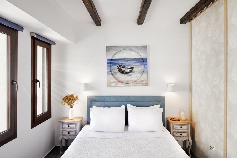 No: 24 1/7 mezoneta - VISOKO PRIZEMLJE / I SPRAT / II SPRAT u prizemlju se nalazi dnevni boravak sa kuhinjom, sofa (2*180cm*75cm) , WC, garderober i terasa, na 1.spratu je spavaća soba sa bračnim ležajem, kuptilo i velika terasa. Na 2.spratu je spavaća soba sa tri obična ležaja (dva su spojena).