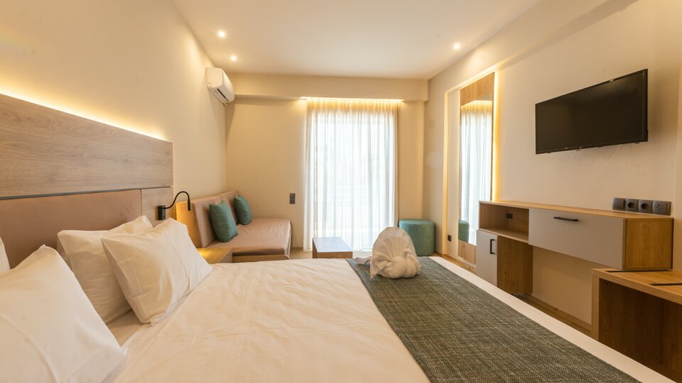 Sadržaj sobe: balkon, fen za kosu, klima uređaj, kupatilo sa tuš kabinom i toaletom, mini bar, peškiri, radio, sef, telefon, tv/sat.